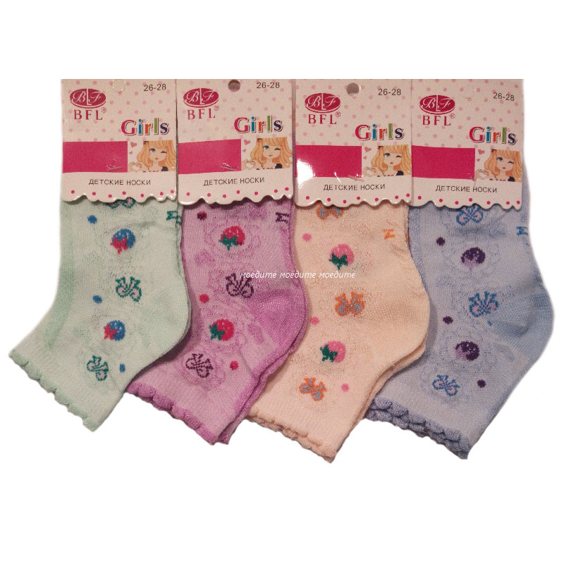 Носки на девочек выполнены из хлопка с добавлением эластана. Подошва гладкая, верх в сеточку, на паголенке рисунок, резинка двойная и ажурная.